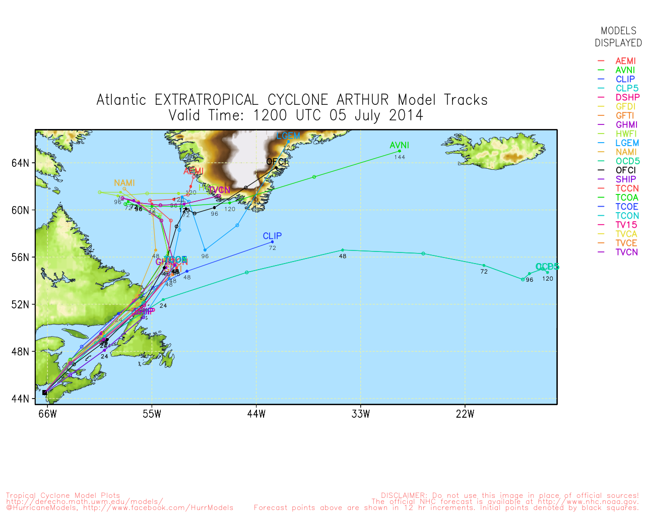 | 18 | 07/05 5:00 AM | 43.1N | 66.9W | 70MPH | 981mb | Ne at 22 MPH | TS | Arthur | 07/05 4:46 AM | Avila |