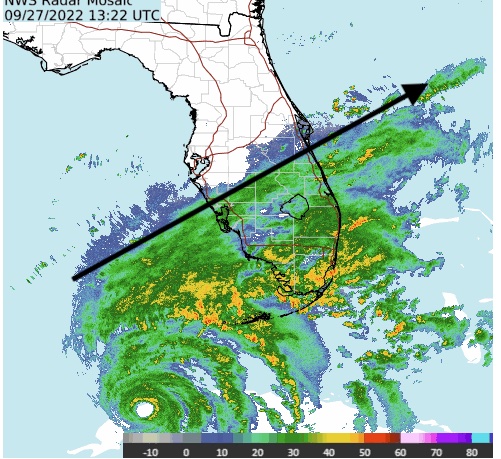 Even more impressive is the satellite imagery (which I couldn't find) because that cloud formation kept up in the same direction all the way across FL and out to the Atlantic. My thinking was that whatever that "front" (quotes because I don't know what that is or is called, but it looks like a winter cold front to me) was, Ian was going to skirt along its edge. What I dodn't get is why the models at that time still had the storm moving across Tampa and up the north. <shrug>