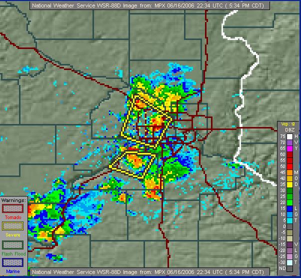 This is pretty wild...I stayed at work a little late tonight and watched as a tiny cell (attached) headed towards downtown Mpls...about five minutes ago we started getting pelted with hail, about dime-size. I'm looking out the window and there's this wild path the wind is taking carrying the hail around and up through the nearby tall buildings. At times just buckets of hail being thrown against my large plate glass window, very impressive. It's suddenly getting pretty dark but the hail let up, just sheets of rain, lightning. First time I've gotten to see this from a high-rise. I just checked the radar and there's a big yellow warning box over Mpls, no surprise. Looks like more nasty stuff on the way too.