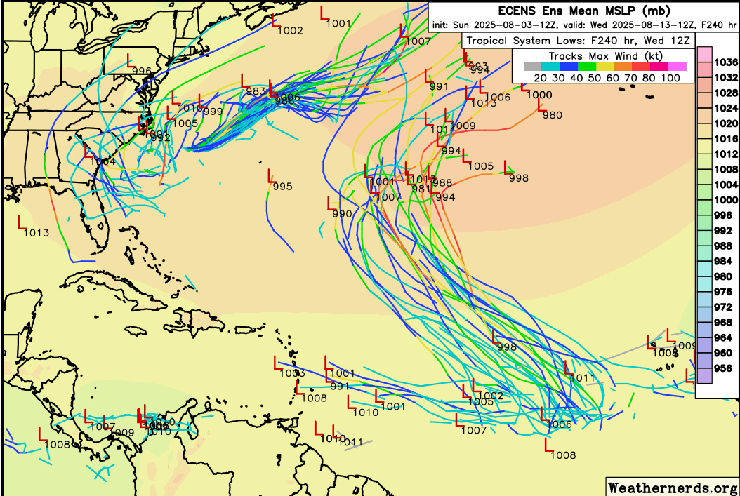 18z Long range show a cat 3 making landfall in Melbourne, FL, from the area in the East Atlantic but the euro and its ensembles all show it recurving well east of the Caribbean. I'm betting on the recurve being much more likely. Showing both. It's important to remember this isn't even off Africa yet.