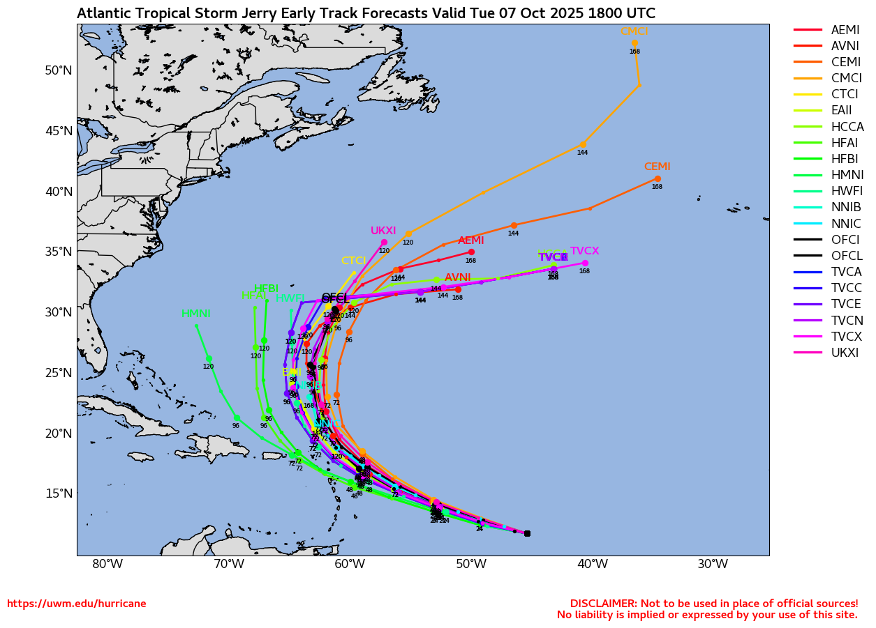 1 | 10/07 9:00 AM | 44.6N | 11.5W | 45MPH | 1006mb | W at 24 MPH | TS | Jerry | 10/07 1:50 PM | Cangialosi |