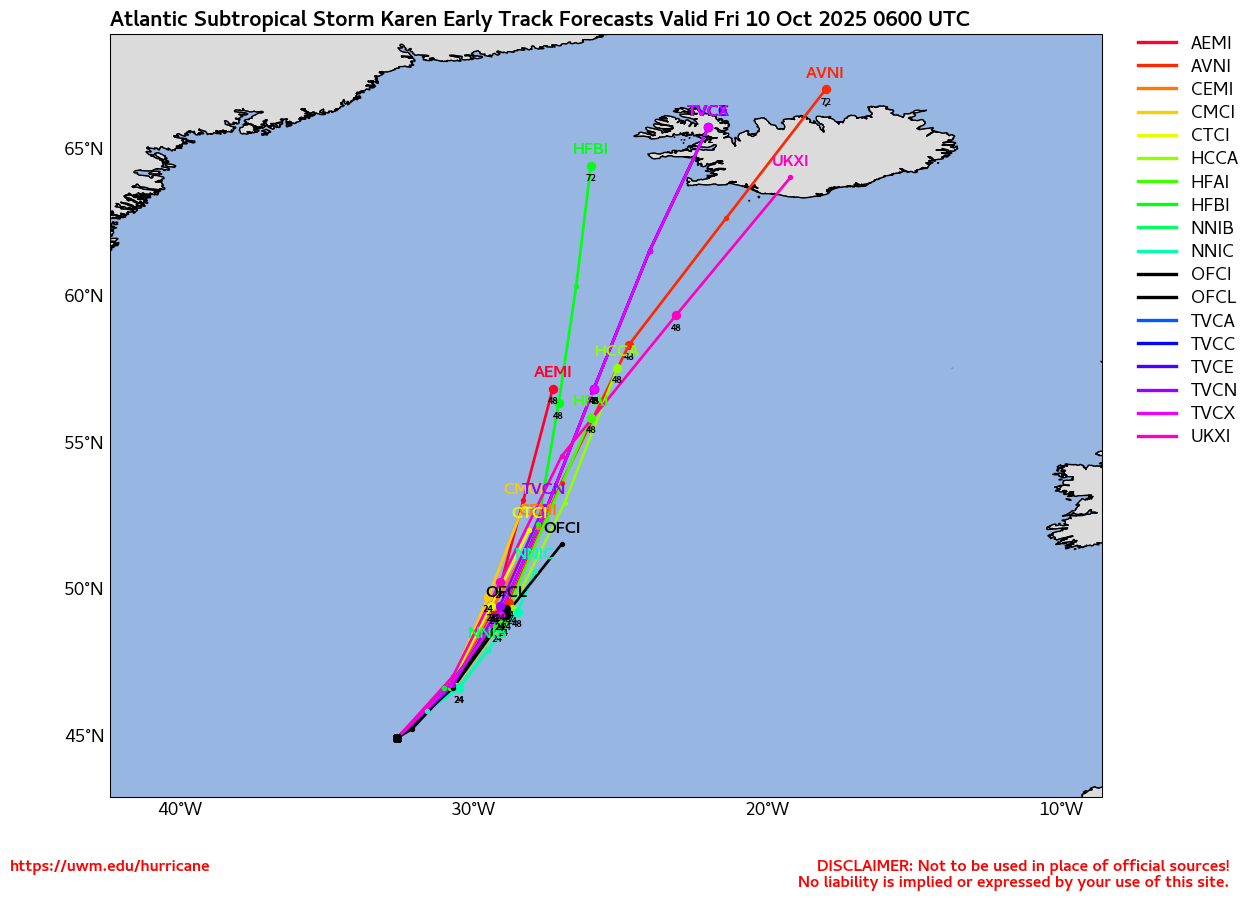 2 | 10/10 5:00 AM | 45.3N | 32.1W | 45MPH | 998mb | Ne at 9 MPH | subTS | Karen | 10/10 5:00 AM | Reinhart |