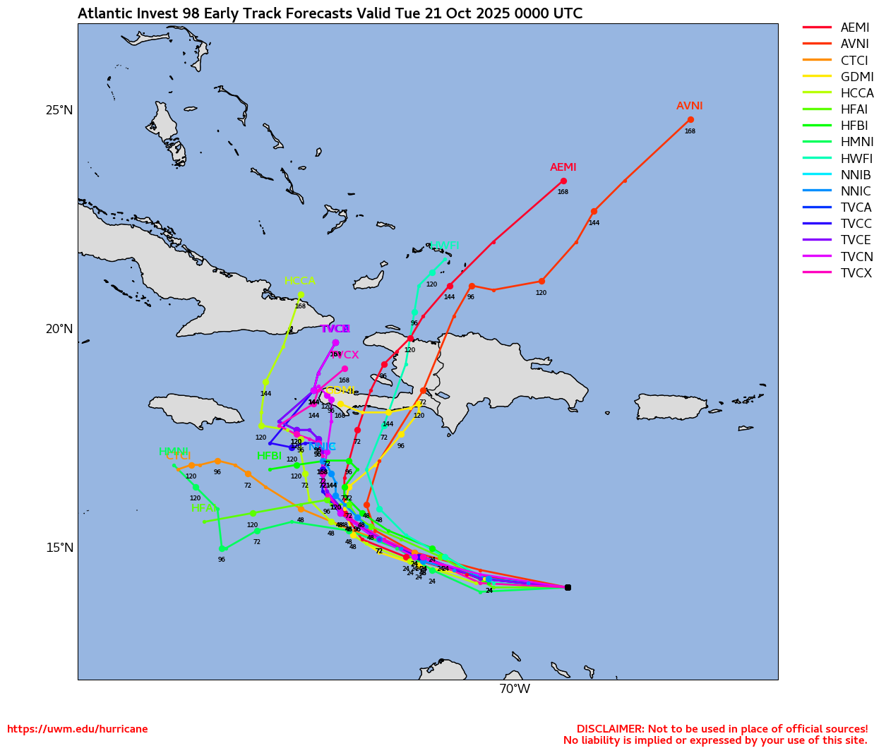 1 | 10/21 11:00 AM | 14.3N | 71.7W | 50MPH | 1003mb | W at 14 MPH | TS | Melissa | 10/21 11:00 AM | Cangialosi/bucci |