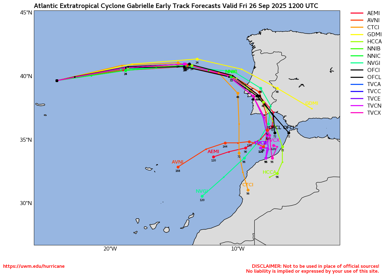 | 38 | 09/26 5:00 AM | 39.1N | 26.1W | 65MPH | 990mb | Ene at 29 MPH | PTC | Gabrielle | 09/26 4:54 AM | Beven |