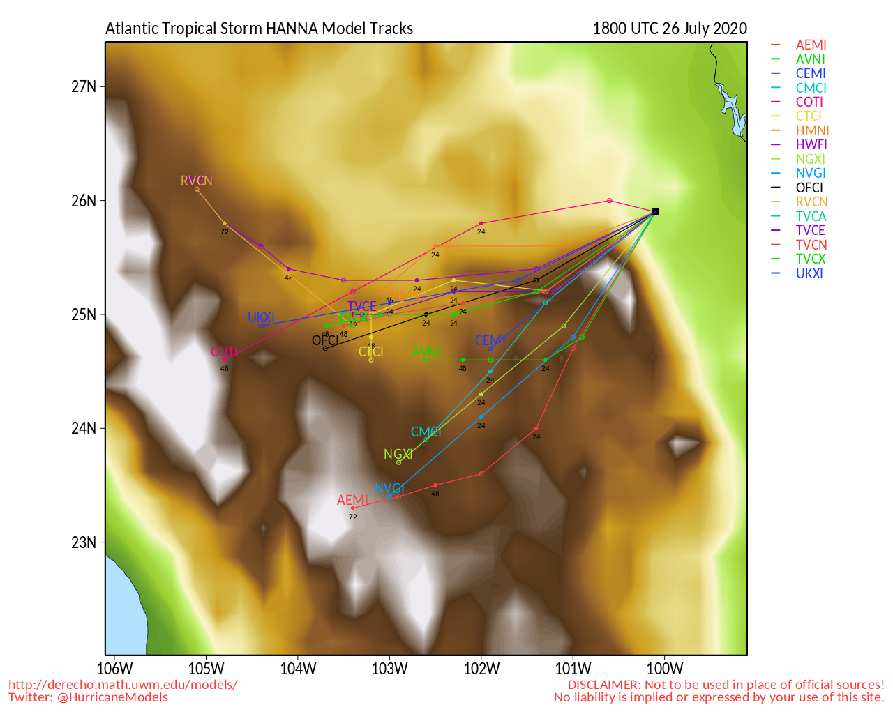 | 14 | 07/26 5:00 AM | 26.3N | 98.9W | 60MPH | 988mb | Wsw at 9 MPH | TS | Hanna | 07/26 5:00 AM | Beven |
