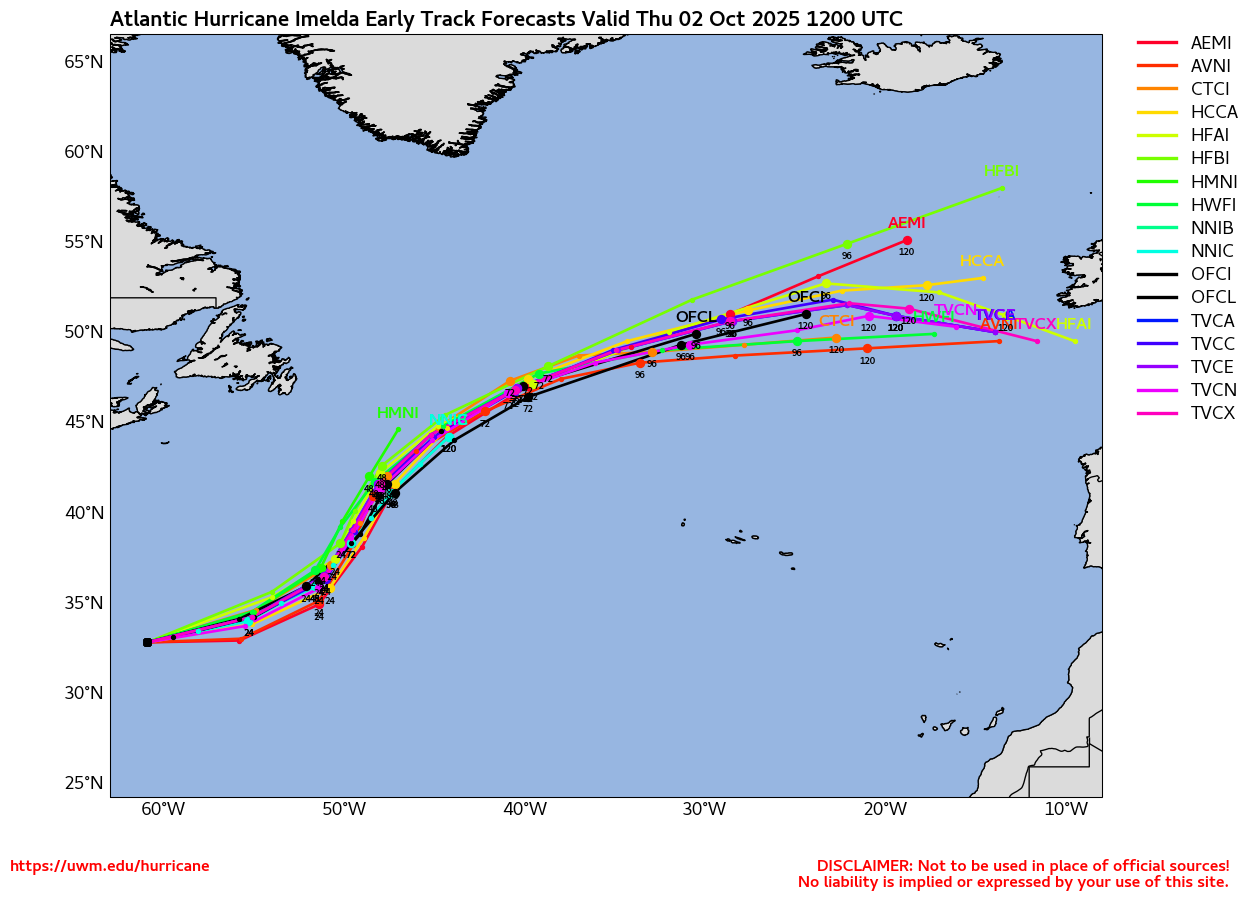 | 20 | 10/01 11:00 AM | 31.0N | 70.4W | 100MPH | 966mb | Ene at 20 MPH | H2 | Imelda | 10/01 11:00 AM | Reinhart |